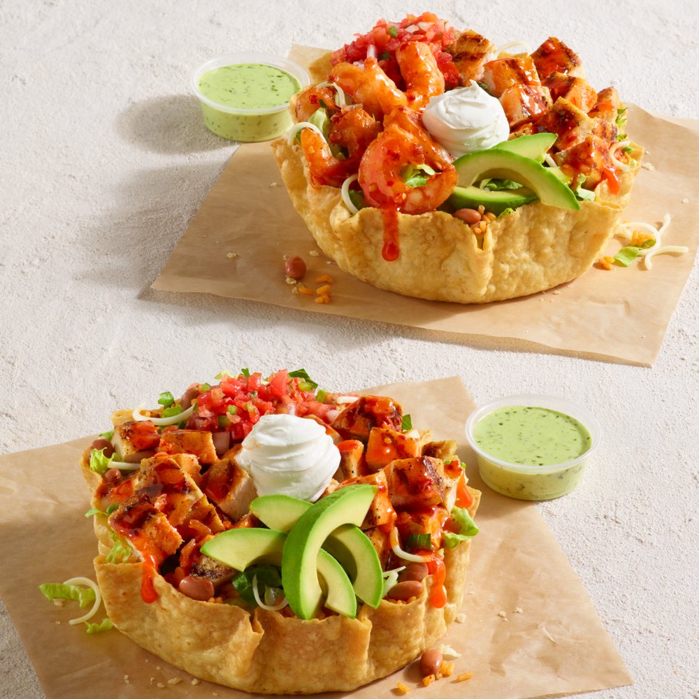 We fill a tostada shell with shredded lettuce, pinto beans, rice, shredded cheese, fresh pico de gallo salsa, ripe hand-sliced avocado and cool sour cream, then top with a double portion of fire-grilled chicken breast. Served with creamy cilantro dressing. Dressing not included in calories.